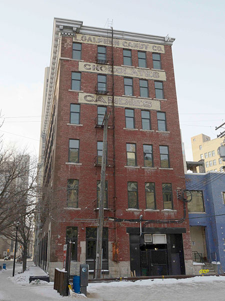 This six-storey brick warehouse in the commercial district east of Main Street, at the intersection of Rorie Street and McDermot Avenue, in Winnipeg was the home for many years of the Galpern candy factory. Designed by local architect John Hamilton Gordon Russell, it was built in 1906 by masonry contractors Thomas Cooper Hindson and William James Davidson (1879-1969), assisted by carpenters McCombe and McKay, painter Crawford, and metal worker John Wallace.