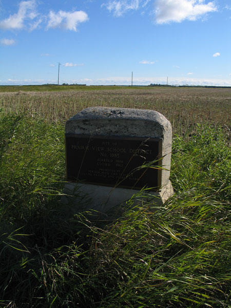 The Prairie View School District was established in July 1900 in the northwest quarter of 36-8-2 west of the Principal Meridian in the Rural Muncipality of Macdonald. A wooden frame school building was tendered for completion by November 1900. It closed in January 1960 and its catchment area was merged with Starbuck Consolidated School District No. 1150. A monument was presented by former student Clark Frantz and former teacher Floris Olsen.