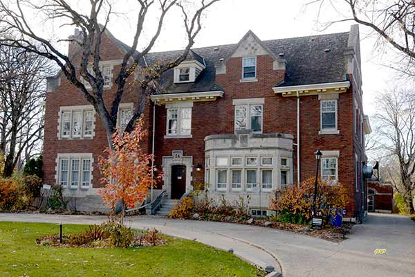 This two-storey brick and Tyndall stone residence in the Armstrong’s Point area of Winnipeg was designed by local architect George W. Northwood and built in 1913 for Reverend Charles W. Gordon, who also wrote novels under the pseudonym Ralph Connor. Since 1945, the house and grounds have been maintained by the University Women’s Club of Winnipeg. Today it is owned and operated as a public meeting place by the Friends of Ralph Connor House.