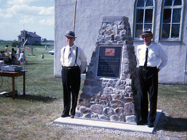 Regent School commemorative monument unveiling with school district secretary-treasurer Bert Hatton at left and trustee and chairman W. L. “Bill” Fox at right and the former school building in the left background and the Regent United Church immediate behind the monument (June 1970)