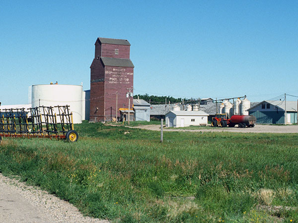 A wooden grain elevator at the railway siding of Rhodes, on the CPR Napinka Subdivision in what is now the Municipality of Killarney-Turtle Mountain, was built in 1928 by Manitoba Pool Elevators. Closed in 1967, the elevator was sold for demolition.