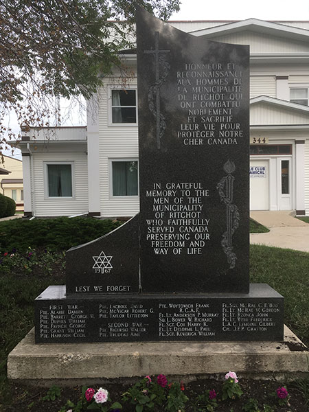 A monument on the grounds of the Rural Municipality of Ritchot office in St. Adolphe was erected to commemorate local persons who were killed during military service.