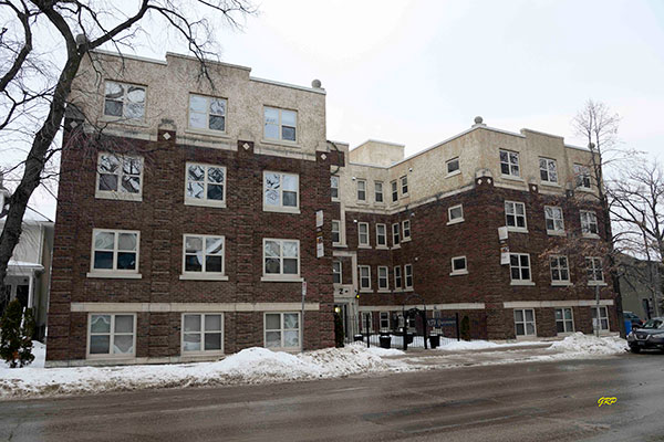 This three-storey brick and Tyndall stone block on Grosvenor Avenue in Winnipeg was constructed in 1928 by Sigmund Lobel and his son Mervyn Joseph Lobel, using structural steel provided by the Dominion Bridge Company, at a cost of about $250,000. The construction plans were prepared by head carpenter Joseph P. Keegan, not a registered architect, which subsequently led to legal action by the Manitoba Association of Architects. Keegan was convicted and fined $50.