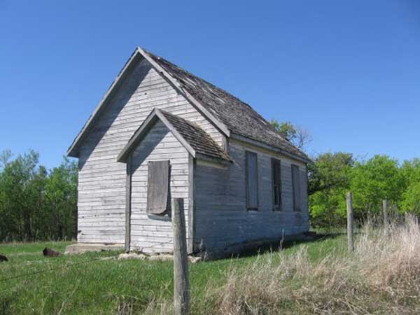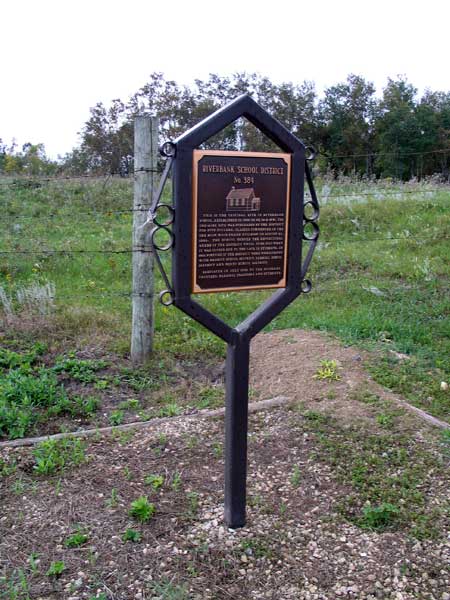 This is the original site of Riverbank School, established in 1886 on NE34-6-19W in what is now the Municipality of Grassland. The one-acre site was purchased by the district for five dollars. Classes commenced in the one-room wood frame building on 23 August 1886. The school served the educational needs of the district until June 1953 when it was closed to the lack of students. In 1961, portions of the district were consolidated with Nesbitt School No. 724, Carroll School No. 868, and Minto School No. 1174. As of 2006, the wood frame building was sitting vacant at its former site but, sometime before August 2010, it burned to the ground. Only its concrete foundation, a few charred floor boards, and the bricks from its chimney remain there now. A monument was dedicated in July 1992 to the pioneers, trustees, parents, teachers, and students of Riverbank School.