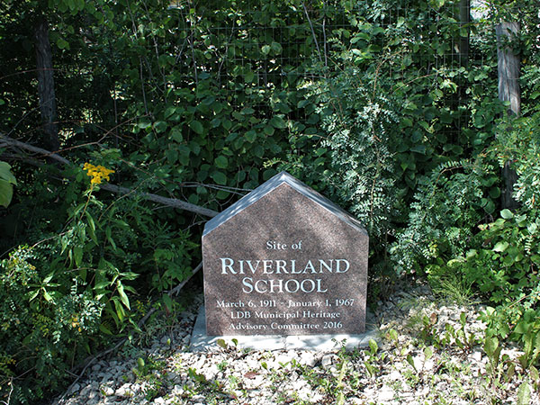 The Riverland School District was organized formally in March 1911 and a school building was erected on land donated by Swedish immigrant Gus Anderson, on the southeast quarter of 15-15-11 east of the Principal Meridian, on Riverland Road in the Rural Municipality of Lac du Bonnet. Enrollment in grades 1 to 8 peaked at 64 students. The school closed in 1967 with remaining students going to Lac du Bonnet Consolidated School No. 2394. The building was declared a municipal historic site in 2008 and local heritage advocates are hoping to restore it. In 2016, a commemorative monument was installed at the site by the Lac du Bonnet Municipal Heritage Advisory Committee.