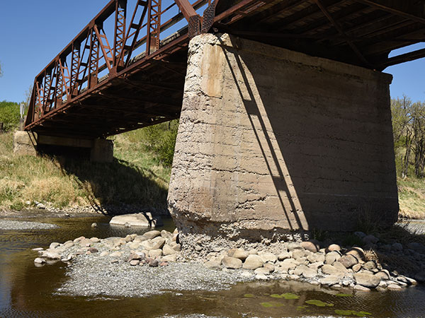 Concrete pier of steel pony truss bridge #1321 over the Souris River (June 2021)