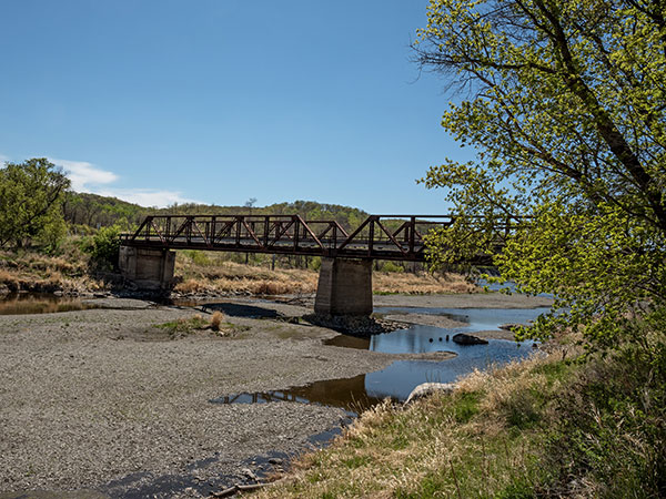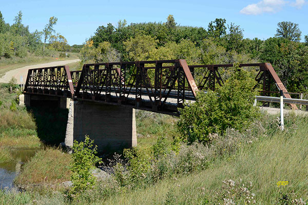 This steel pony truss bridge over the Souris River, along provincial highway 346 in the Rural Municipality of Prairie Lakes, was constructed in 1927 using Plan No. 1321. Wooden piles under the bridge, visible during low-water conditions in 2021, reveal the presence of a prior bridge.