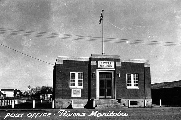 Postcard view of the Dominion Post Office Building at Rivers (1940)