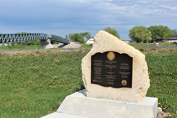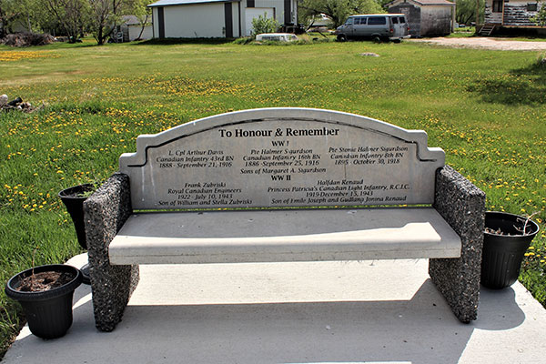 A monument at Riverton, erected by the United Veterans of Manitoba on 8 November 2015, commemorates the First Nation, Metis, and Inuit veterans, and is in remembrance of all veterans who served, fought, and died in defense of Canada and North America. Along the pathway is a concrete bench inscribed with the names of the five Riverton military personnel who died in the First World War and Second World War.
