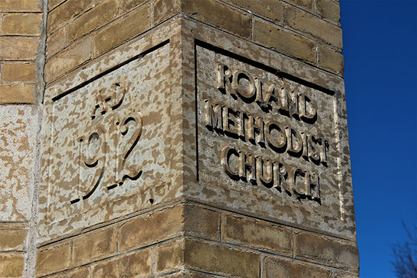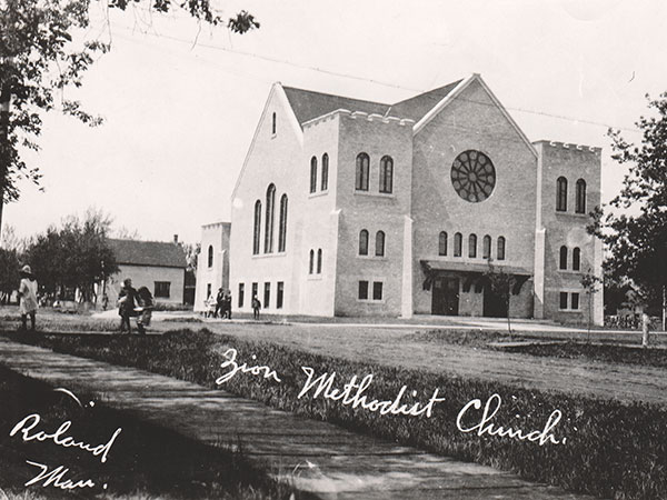 Roland’s first church, Grace Methodist, was built between 1889 and 1890 on this site in the Rural Municipality of Roland, opening with Rev. A. Gordon as first minister. The wood frame structure was destroyed by fire in February 1912, despite efforts of a fire brigade carrying buckets of water from local wells. They managed to save the pump organ.