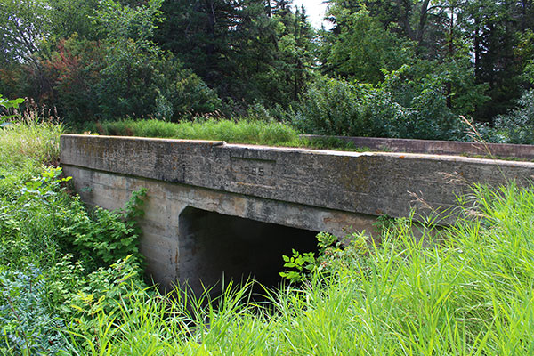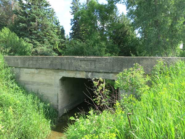 This concrete culvert bridge at Roseisle in the Rural Municipality of Dufferin was constructed in 1925 by the Winnipeg-based firm of Lacour and Schioler, using Plan 1178, for $1,048.