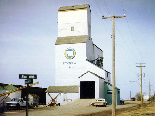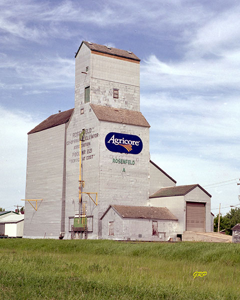 A wooden grain elevator at Rosenfeld, on the CPR Carman Subdivision in the Rural Municipality of Rhineland, was built in 1948 by Manitoba Pool Elevators. Renovated in 1969 and 1983, an annex was built beside it in 1968. Closed around 1996, replaced by a large terminal near Letellier, it demolished in mid-2001.