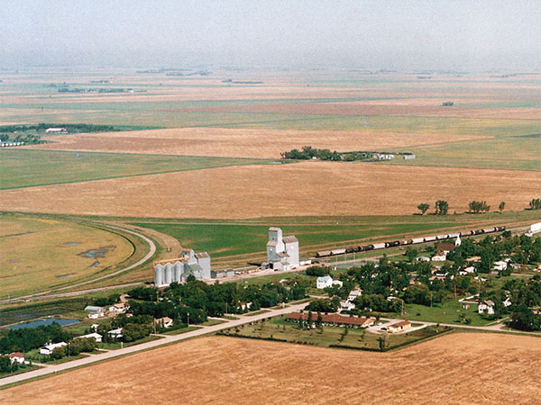 Aerial view of the Manitoba Pool grain elevators B (left) and A (right) at Rosenfeld (1980s)