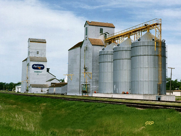 A wooden grain elevator at Rosenfeld, on the CPR Carman Subdivision in the Rural Municipality of Rhineland, was built in 1919 and renovated in 1966. An annex was built beside it in 1969, and three steel tanks were added later. Operated by Manitoba Pool Elevators, it was closed around 1996, replaced by a large terminal near Letellier, and demolished in mid-2001.