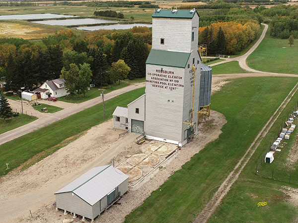 Aerial view of the former Manitoba Pool grain elevator at Rossburn (September 2020)