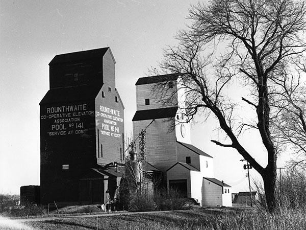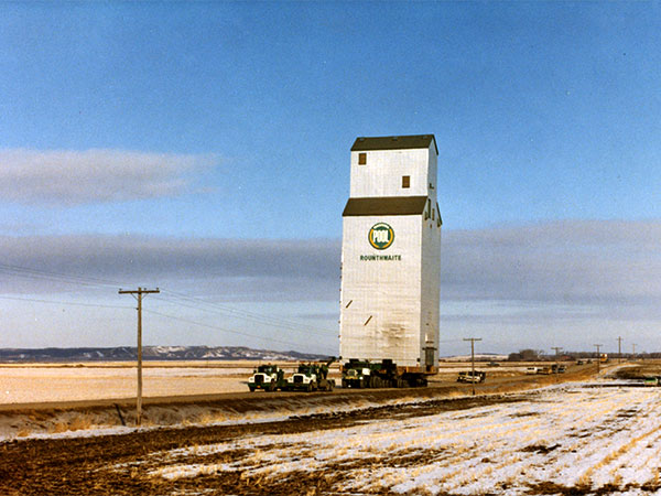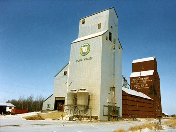 In July 1972, a wooden grain elevator at this site in Rounthwaite, on the CNR Wawanesa Subdivision in what is now the Municipality of Oakland-Wawanesa, was destroyed by fire. It had been purchased from Federal Grain, shortly before the fire, by Manitoba Pool Elevators and was to have been repainted in the new corporate colours a few days later. A new elevator was constructed on the same spot between 1974 and 1975 and designated as Manitoba Pool B. When the railway line was abandoned in December 1983, the elevator was closed and moved to Nesbitt.