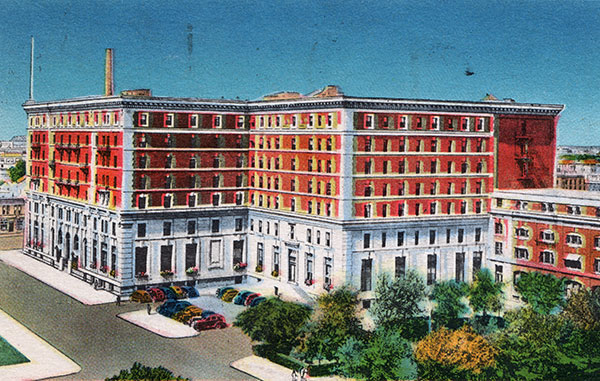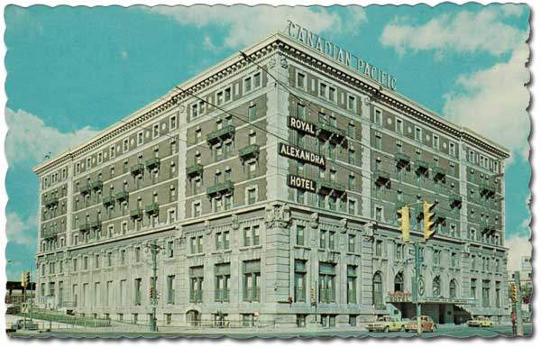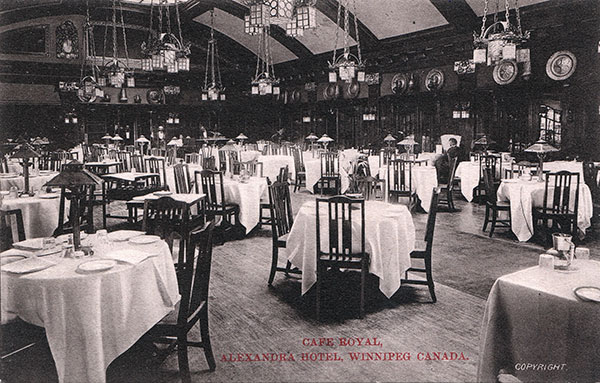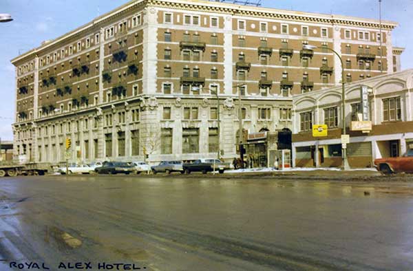 The Royal Alexandra Hotel was designed for the Canadian Pacific Railway by Montreal architects Edward and William Maxwell and built by contractor Alexander A. Woodward at the north-east corner of Higgins Avenue and Main Street in Winnipeg. Upon opening in 1906, the “Royal Alex” was considered one of the finest hotels in western Canada and, for many years, it served as the social centre of Winnipeg. For example, the hotel hosted meetings of the Canadian Club of Winnipeg and a plaque listing Club members killed during the First World War was displayed there. (It is now stored at the Archives of Manitoba.)