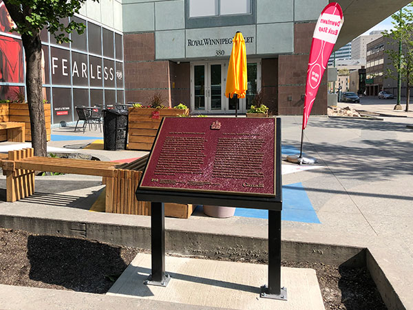 Commemoration plaque by the Royal Winnipeg Ballet building (June 2019)