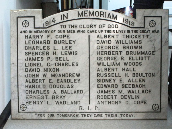 A grey marble memorial tablet containing the names of twenty-six members of the congregation who fell during the First World War was unveiled at a ceremony on the afternoon of 27 April 1919. It is stored inside the church.