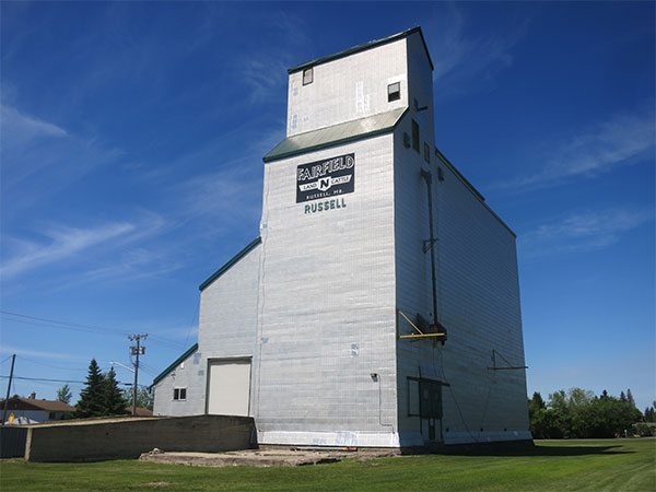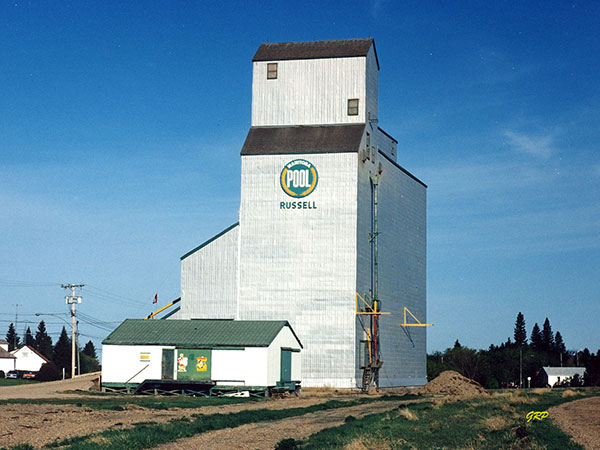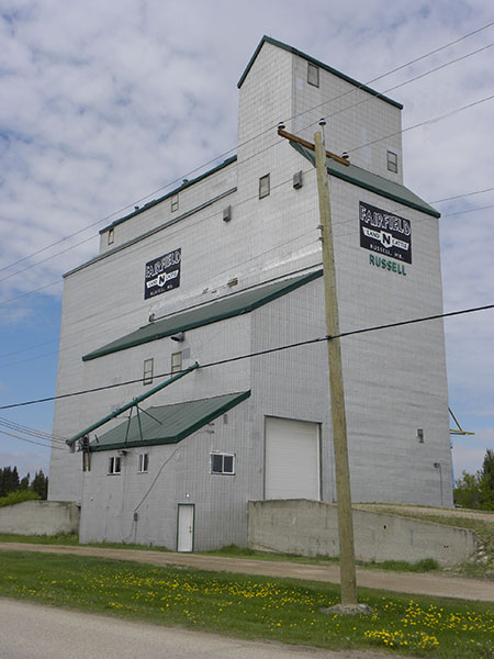 A wooden grain elevator in Russell, on the CNR Rossburn Subdivision in what is now the Municipality of Russell-Binscarth, was built by Manitoba Pool Elevators in late 1974 to replace an elevator destroyed by fire on 5 March 1974. It opened officially on 30 January 1975. Closed by Agricore in 2001 and sold to local interests, the off-track facility remains in use for private grain storage.