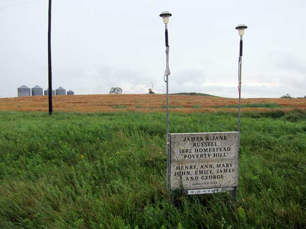 This stone plaque in the Rural Municipality of Prairie Lakes, dedicated in 2004, commemorates James and Jane Russell, who homesteaded the northeast quarter of 26-4-18 west of the Principal Meridian in 1882.