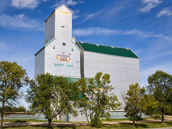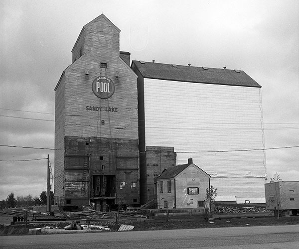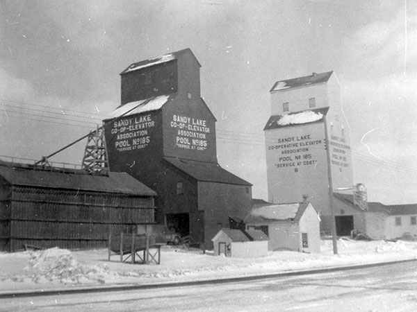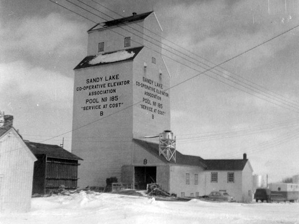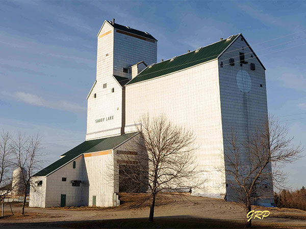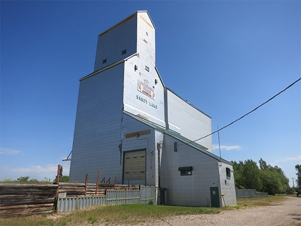 A wooden grain elevator at Sandy Lake, on the CNR Rossburn Subdivision in the Municipality of Harrison Park, was built in 1953 by Manitoba Pool Elevators and an attached crib annex dates from 1967. Extensively renovated in 1986, the facility was closed in April 1996, due to abandonment of its railway line, and sold into private hands. It continues in use for local grain storage.