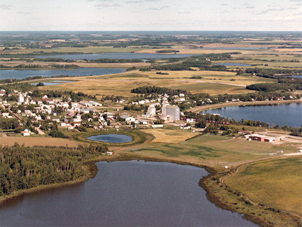 Aerial view of grain elevators at Sandy Lake (1980s)