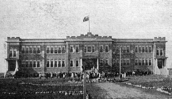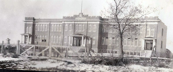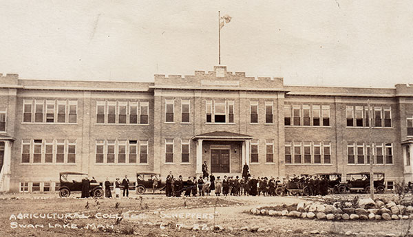 In early 1920, members of the Our Lady of Mercy monastic order, newly arrived from Belgium, purchased farm land from George H. Couch near the village of Swan Lake in the Rural Municipality of Lorne. Their plan was to establish an educational college for Catholic farm boys. A two-storey brick and stone building measuring 148 feet (45 meters) long and 82 feet (25 meters) wide, designed by St. James engineer Armand J. Boissonneau, was built later that year by St. Boniface contractor Firmin Wyndels, at a cost of some $70,000. Known informally as Scheppers College, for the Order’s founder Victor Scheppers (1802-1877), it was formally named the Sacred Heart College (Collège du Sacré Coeur). Consecrated by Archbishop Arthur Beliveau of St. Boniface, it opened for classes in October 1920 with Brother Mathieu as Principal.