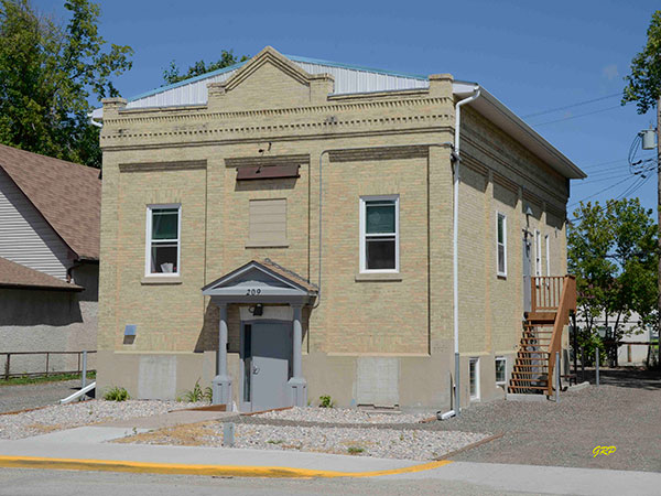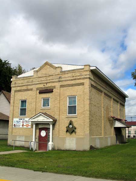 Lisgar Lodge #2 of the Masons was formed in Selkirk in February 1870 and chartered in July 1871. Meetings were held in various places in the area until this building was built in 1920. The building is brick on a wood frame. Renovated in 2019, the exterior features decorative brick belts and corbelling around the roof cornice level. The only windows are in the front, and the front door is accented by a pediment which rises above the rest of the roof. The door is sheltered by a hood supported by two columns.