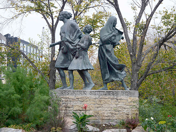 This monument, a twin of one erected in Helmsdale, Scotland and sculpted by Gerald Laing of Scotland, commemorates these people of Scotland who sought freedom, hope and justice beyond their native shores. One such group, with the support of Thomas Douglas, Fifth Earl of Selkirk, established the first agricultural settlement here in Manitoba, in present-day Winnipeg. The Scots cleared from lands in 1812, planted a bushel and a half of wheat brought over from Scotland, and established the first European agricultural settlement in Manitoba.