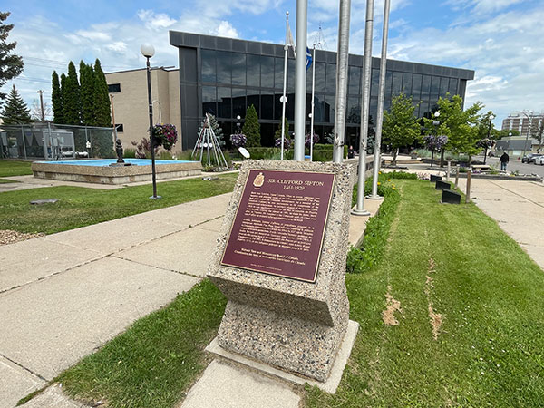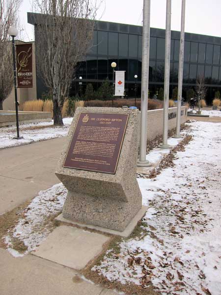 This plaque in front of the Brandon City Hall, erected in 1955 by the Historic Sites and Monuments Board of Canada, commemorates politican Clifford Sifton. Born near London, Upper Canada (now Ontario), Sifton as lawyer, politician, businessman and principal owner of the influential Manitoba Free Press, had great impact on Canadian development. As a member of the Manitoba Cabinet, he was instrumental in the compromise of the controversial school issue. As Laurier’s Minister of the Interior (1896 to 1905) he was chiefly responsible for the plan to populate the Prairies with farmers. Leaving the cabinet in 1905, he made his home, thereafter, in Toronto. He remained in the Commons until 1911 but even out of office his political influence continued until his death.