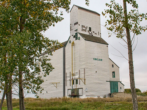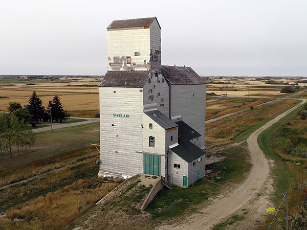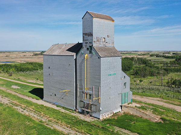 A wooden grain elevator at Sinclair, on the CPR Arcola Subdivision in the Rural Municipality of Pipestone, was built in 1928 by Manitoba Pool Elevators on behalf of a local association. In 1965, a new crib annex was built on the west side of the elevator, increasing its original 50,000-bushel capacity to 151,400 bushels. Renovations made in 1976 included installation of a digital scale, a new hoist, a second leg, and a new driveshed and office. Closed in 2002, the elevator was sold into private ownership. Used for a few years for local grain storage, it has been unused for over a decade, according to local residents.