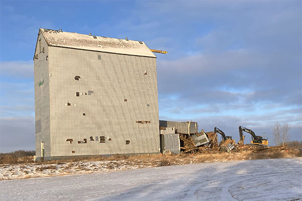 Former Manitoba Pool grain elevator at Sinclair under demolition (December 2024)