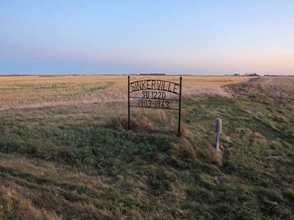 The Sinkerville School District was established formally in March 1903, named for local farmer George Sinker (c1816-1910). A frame school building was erected on the northeast quarter of 11-1-13 west of the Principal Meridian, in what is now the Municipality of Cartwright-Roblin. It closed in 1963 and its remaining students went to Mather School No. 1345. The district was dissolved in 1967. The school building is no longer present at the site, having been moved to SE15-1-13W for use as a storage shed, but a metal sign commemorates it at the original site.