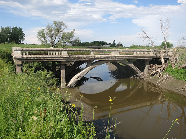 This concrete arch bridge over the Oak River, formerly in the Rural Municipality of Woodworth and now in the Sioux Valley Dakota Nation, was constructed between July 1917 and February 1918 by Saskatchewan-based contractor Levi O. Beam (1874-?), using Plan No. 183, for the Manitoba Good Roads Board, at a total cost of $10,293 shared equally by the municipal and provincial governments. It is now abandoned south of the present-day highway.