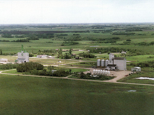 Aerial view of the grain elevators at Solsgirth (1990s)