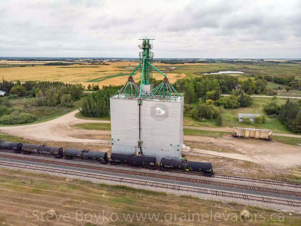 Aerial view of the former Manitoba Pool grain elevator at Solsgirth (September 2020)