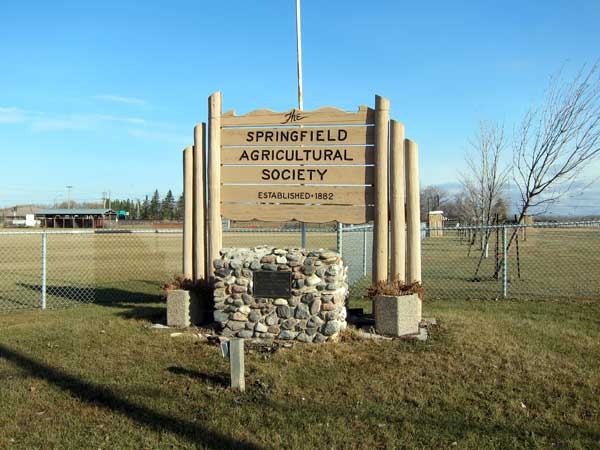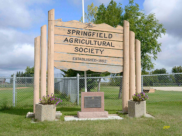 A monument at Dugald, in the Rural Municipality of Springfield, commemorates the 100th anniversary of the Springfield Agricultural Society, established in 1882. A plaque was presented to the Society by Minister of Agriculture William “Billie” Uruski and Premier Howard Russell Pawley.
