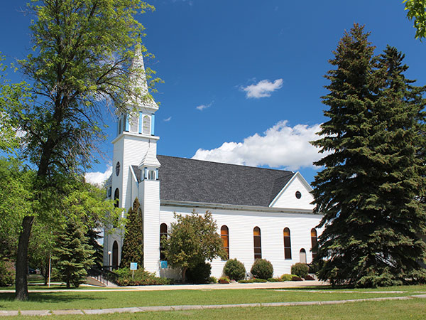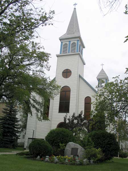In front of this Roman Catholic church, in St. Adolphe in the Rural Municipality of Ritchot, is a small monument for the centenary of the St. Adolphe Parish, celebrated in 1996. A cemetery is situated behind the church, and a convent stood immediately north of it.