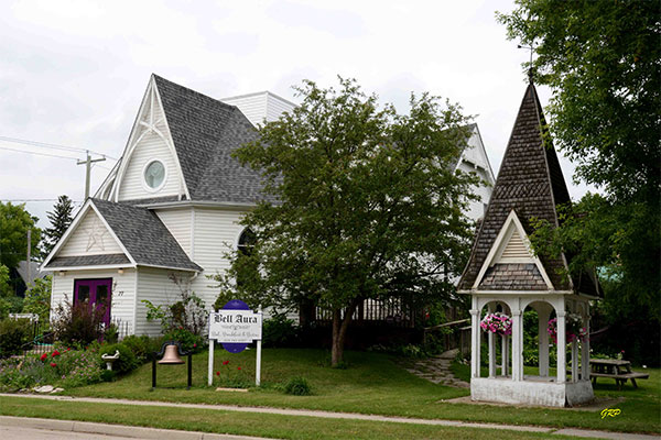 This impressive building at the intersection of Second Avenue SW and Second Street SW in Carman was designed and built by local contractor Edmund Watson and opened in February 1899 by the congregation of St. Andrew’s Presbyterian Church. In 1925, the congregation voted to merge with that of Albert Carman Methodist Church to become Carman United Church but separate services were held until July 1941, at which time this church closed. In 1945, the building was sold to the Church of Christ congregation. At some point it was renovated into a private residence, bed and breakfast, and bistro. The 1898 cornerstone of the former church is placed at the base of its steeple.