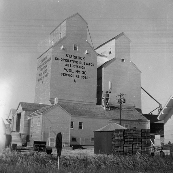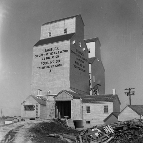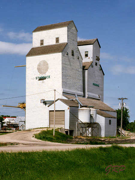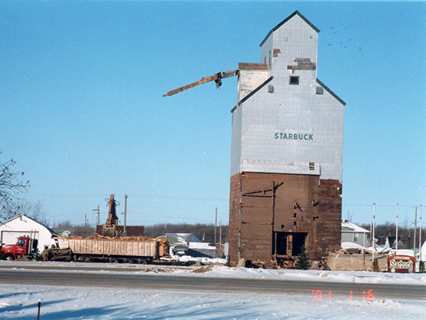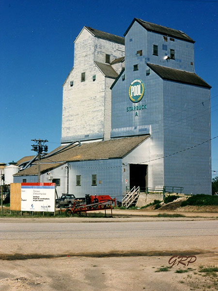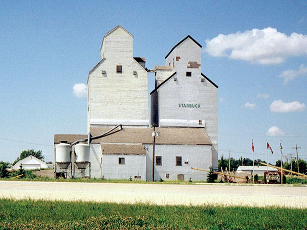 A pair of wooden grain elevators in Starbuck, on the CPR Glenboro Subdivision in the Rural Municipality of Macdonald, were operated by Manitoba Pool Elevators. In 1993, the elevators were replaced by a larger, concrete elevator to the east of them then they were demolished in January 2001. The elevators are commemorated at the site by a monument built by Len Goldsborough.
