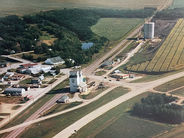 Aerial view of the Starbuck grain elevators with a new concrete replacement under construction in the background (1992)