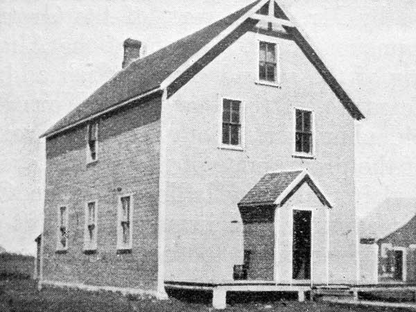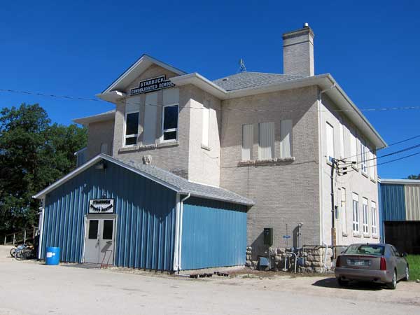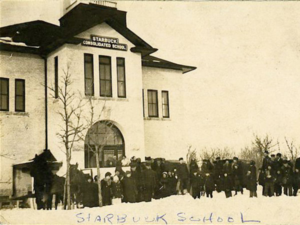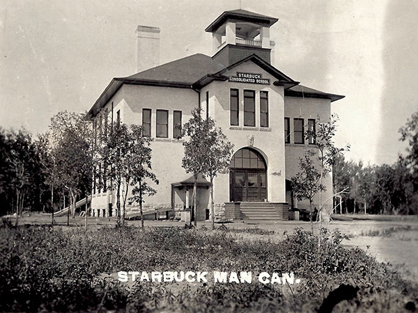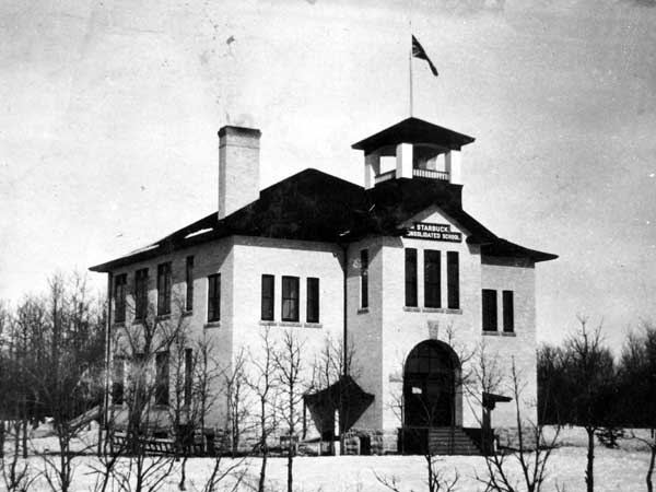 The Starbuck Consolidated School District was organized in August 1909 as a result of consolidation of Holyrood School No. 391, Kinlough School No. 784, and Starbuck School No. 1150. The 10-acre school site bordering the Lasalle River in Starbuck, in the Rural Municipality of Macdonald, was purchased at a cost of $1,000. In 1910, a two-storey building, designed by Winnipeg architect Eldred Dodsworth Tuttle, was constructed of white bricks on a stone foundation. It featured four classrooms, two on each floor, as well as a laboratory, a room for “storage of chemical and physical apparatus,” and a library. Two playrooms were located in the basement, along with two lavatories, a forced-air furnace room, a coal storage room, and a storeroom. The total cost of construction was $17,000 acquired by the sale of old school property and the issue of debentures. It opened in mid-November 1910 under principal Andrew Moore.
