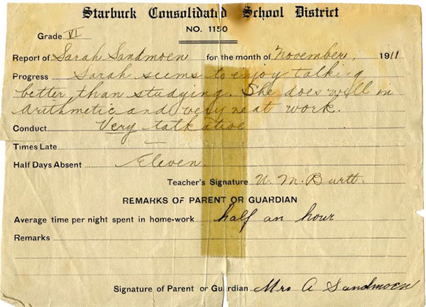 Report card for a student from Starbuck Consolidated School (November 1911)