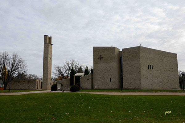 The Roman Catholic church in St. Claude, in the Rural Municipality of Grey, was designed by noted architect Etienne Gaboury and built between 1964 and 1965. The bell tower from the town’s second church, dating from 1921, is preserved on the grounds.