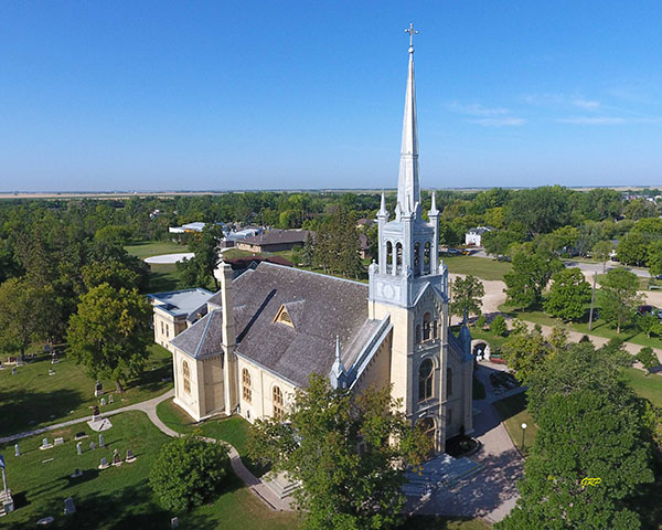 Aerial view of Ste. Anne Roman Catholic Church (August 2019)