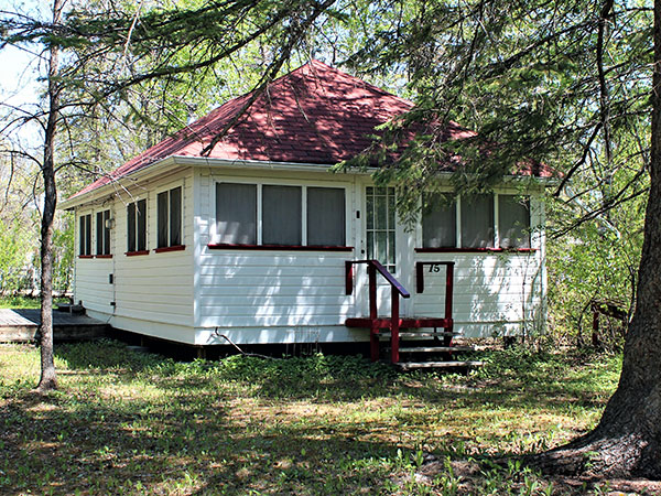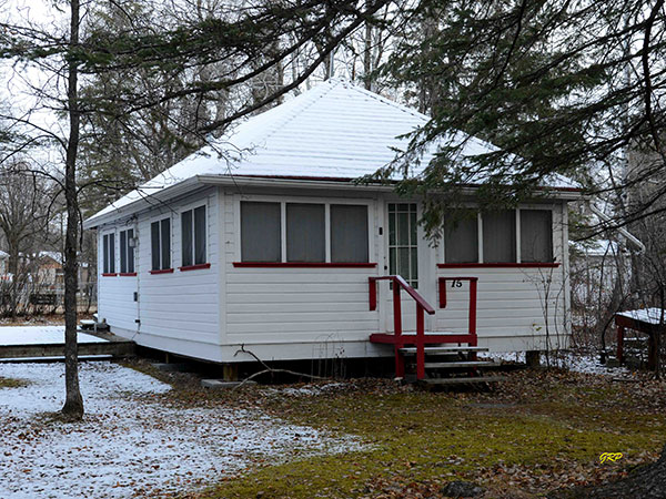 This residential cottage on Bay Avenue in Dunnottar was built in 1933 by brothers William G. D. Stebbing (1901-1980) and Herbert D. Stebbing (1902-1987), and was probably named Norfolk Lodge after the ancestral home of the Stebbing family in West Dereham, Norfolk County, England. The hip-roof wood-frame structure is original with an unusually high degree of physical integrity. Nearly every feature is original to the building, including its windows, siding, and details. All its unpainted rooms are open to the studs on the walls and ceilings, and the flooring is covered with old linoleum. Varnished fir panelling on half walls separate the bedrooms from the main room. The verandah is screened with shutters that are hooked onto chains.