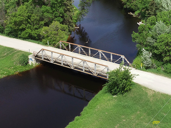 Aerial view of steel pony truss bridge over the Brokenhead River (June 2020)