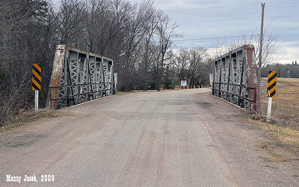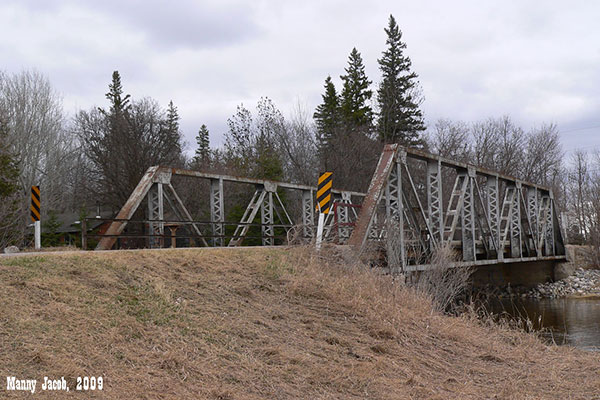 This steel pony truss bridge over the Brokenhead River in the Rural Municipality of Brokenhead was constructed in 1927 by the Winnipeg firms of Macaw and Macdonald and Manitoba Bridge and Iron Works at a cost of $12,279. At that time, it was part of the original Trans-Canada Highway. Now used for local traffic, it parallels a portion of Provincial Trunk Highway 44.