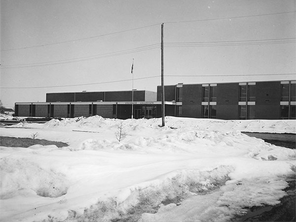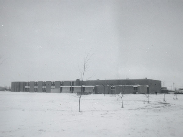 The structure’s initial configuration had 34 rooms and replaced previous collegiate grade capacity at Steinbach Collegiate / Steinbach School No. 2. It was dedicated by Reverend H. P. Friesen and was officially unveiled on 8 March 1962 by Premier Duff Roblin and Education Minister Stewart McLean. Other dignitaries included Mayor Leonard A. Barkman, Hanover School Division Chairman Seb. B. Rieger, architect Gerry Macdonald along with MLAs and school officials. The cornerstone, containing copies of the Winnipeg Free Press, Steinbach Carillon News, Steinbach Post, a 1961 Steinbach Collegiate yearbook, inaugural staff roster, photos of the school, along with the official program, was set and sealed during the ceremony.